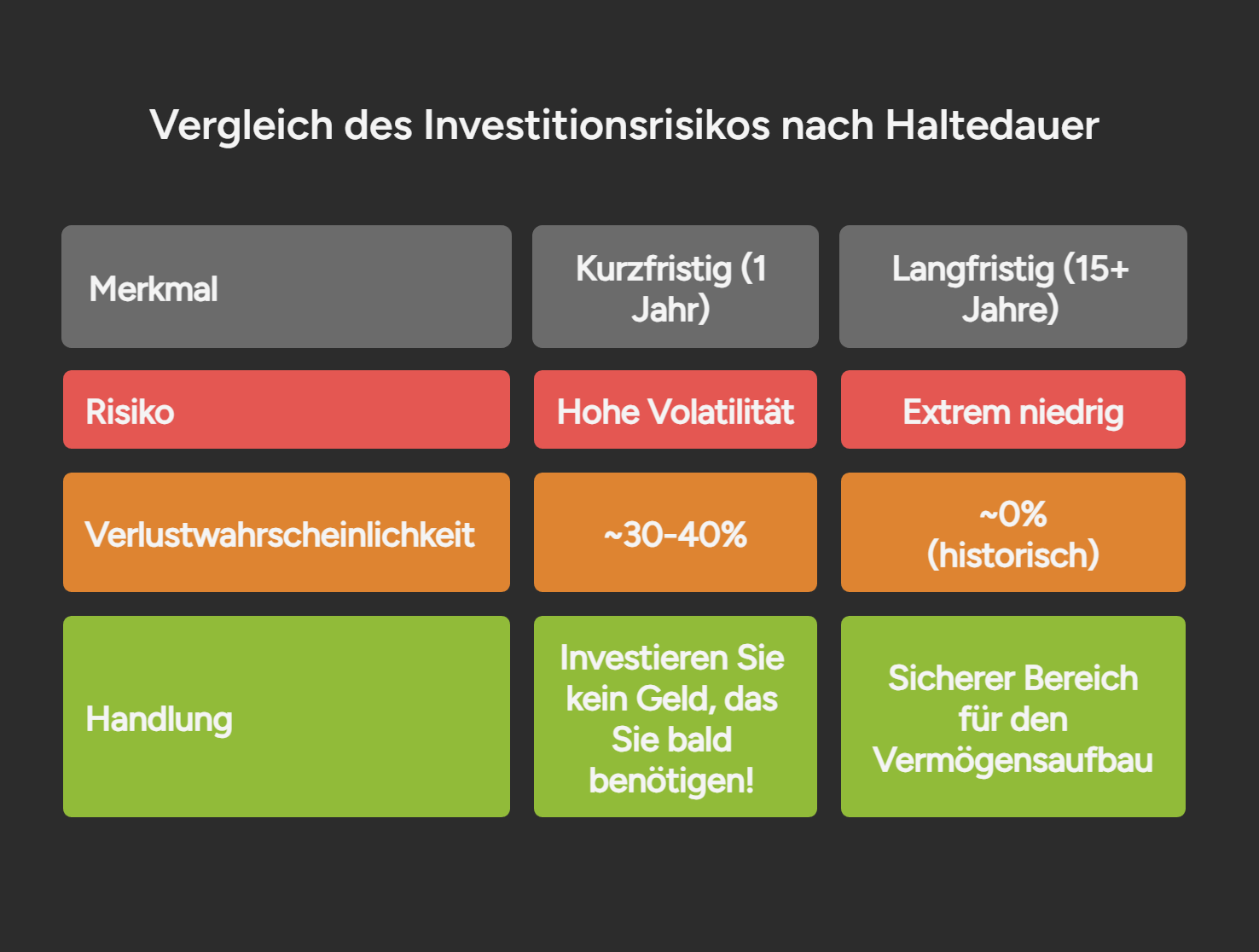 Rendite + SicherheitKeine LiquiditätWelt-ETF über 15 Jahre. Historisch gesehen war das Risiko eines Verlusts Null (Sicherheit durch Zeit). Aber du musst bereit sein, Schwankungen auszusitzen.