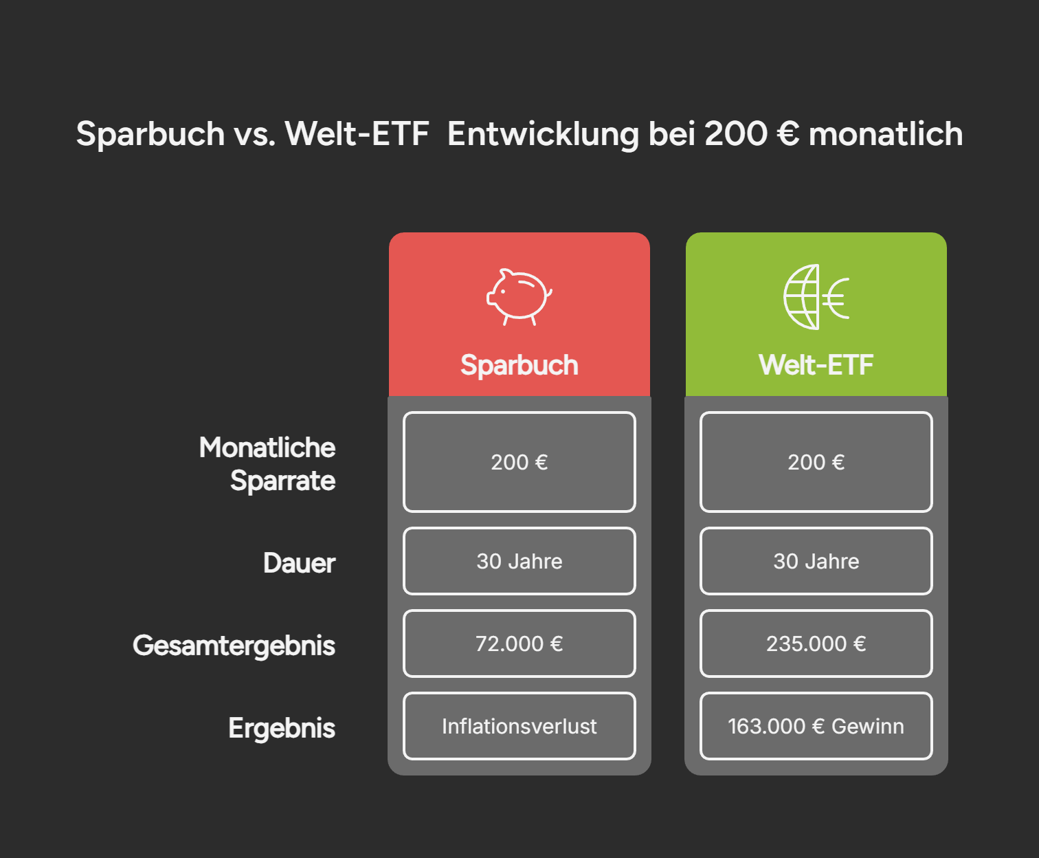 • Szenario B (Welt-ETF, ca. 7 % nominal p.a.): Du hast ebenfalls 72.000 € eingezahlt. Dein Depotwert liegt aber bei ca. 235.000 €.